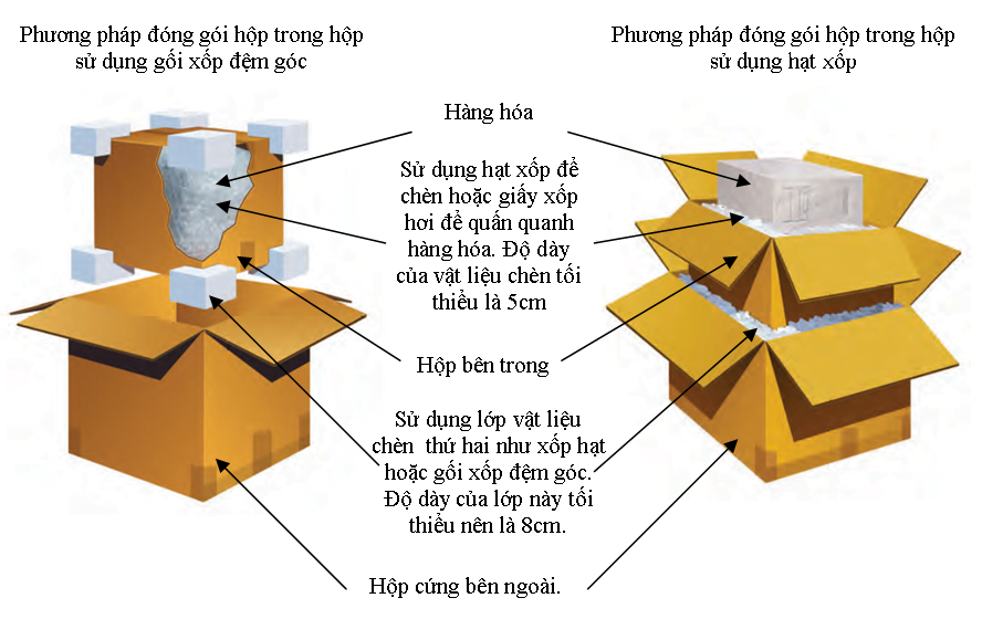 Khi đóng gói hàng hóa cần chèn kín các không gian xung quanh bằng hạt xốp, giấy bọt khí, vải len, … nhằm giữ cố định cho hàng hóa bên trong, tránh sự dịch chuyển của hàng hóa bên trong thùng hộp khi vận chuyển.